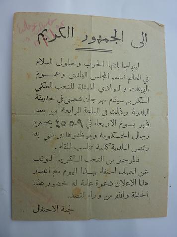 תמונה 5. כרוז בשפה הערבית הנושא את התאריך 9 במאי 1945 – יום סיום מלחמת העולם השנייה. בכרוז, מזמין ראש עירית עכו חוסני חָלִיפה את תושבי עכו והאזור (כולל חיפה והכפרים) לחאפלה גדולה לכבוד הנביא מוחמד.