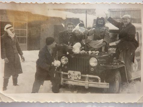 תמונה 7. השלג בעכו – פברואר 1950. הג'יפ של הצלב האדום בשירות המנדט הבריטי ניצב בככר אל-לוּמַן (בית המעצר) – ככר פרחי דהיום. מי על הג'יפ? שייך עבּדוּ, שהיה סָפֵק עושה להטים ולוכד נחשים ספק משוגע. ליד הגלגל הימני הקדמי עומד ג'מיל מוּרסי – אביו של מורסי מוכר הנעלים.