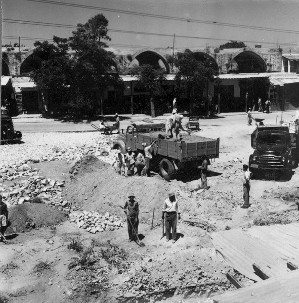 בתמונה למטה – עבודות תשתית בככר פרחי בשנת 1957. מאוסף ערי גלס