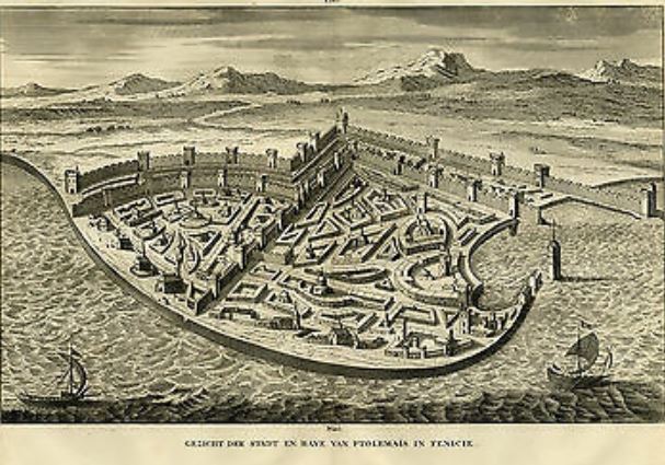 מפה סכמתית תלת-ממדית של עכו העתיקה מאת אמן לא ידוע. מופיעה באנציקלופדיה של ארץ הקודש שערך קלמט בשנת 1725 (A.Calmet) המקור: ISCRA – AQNTIQUE MAPS & PRINTS